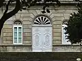 The upper floor has a large balcony with a balustrade and three further semicircular arches framed by Corinthian columns, also fluted. These columns frame the windows of the noble room.[5] Above them there are three oeils-de-boeuf and a triangular pediment on which the coat of arms of the province of Pontevedra is displayed. The windows in the corners of the building are topped by semicircular Pediments. They are decorated with Lintels with Scallops.