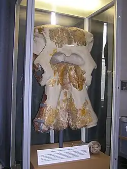 The species was described in 1955 based on a partial adult skull (ZIN 27052), as well as an associated atlas vertebra and partial femur, found in Khuday-Dag near Krasnovodsk in what is now western Turkmenistan (then the Turkmen Soviet Socialist Republic in the Soviet Union) in Central Asia, dating to the early Middle Pleistocene.[1][2] Its validity was historically considered uncertain, with a 2004 study suggesting that it was a synonym of the largely European straight-tusked elephant (Palaeoloxodon antiquus).[2] In 2024, a skull of a mature bull (WMNH-VP-F1), around 45-55 years of age was attributed to the species from India, Jammu and Kashmir, Galandhar near Pampore in the Kashmir Valley located in the northwest of the India (probably also of Middle Pleistocene age), with this study affirming the validity of P. turkmenicus as a distinct species of Palaeoloxodon.[3] Other remains from the site probably attributable to the specimen include the mandibles, the altas, a partial scapula, some fragmentary thoracic vertebrae, ribs and limb bone fragments, with the fragmentary remains of several other elephants (including a juvenile) also known from the site.[4] The 2024 study proposed that Palaeoloxodon turkmenicus may represent the ancestor of other Eurasian Palaeoloxodon species, but noted that given the current paucity of skull remains of early Middle Pleistocene Palaeoloxodon that this hypothesis was tenative.[3]