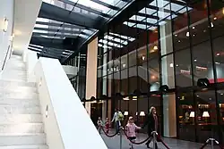 Even prior to completion of the third annex, in October 1988 the Council of the then European Communities authorised the need for a fourth extension, recognising the need for office space to cope with an increasing workflow and the future demands of additional staff caused by future possible enlargements.[6] In 1996, this task was awarded to Paris-based architect Dominique Perrault following an architectural competition. The existence of asbestos in the Ancien Palais building, as well as outdated office arrangements in a building designed prior to the incorporation of modern IT services would require the gutting of the internals of the existing structures. Asbestos removal work began in 2000, with a ground-breaking ceremony held in 2002, and construction works on the fourth extension only beginning in earnest in 2004, and lasting until 2008, with the inauguration ceremony occurring on 4 December of that year.[7][8] Subsequent renovation works on the three annex buildings also occurred.