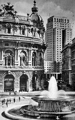 On 27 June 1905 the Nuova Borsa company was founded to build the building, which cost seven million lire at the time.[1] In 1912, the Commodities Exchange remained in the Loggia di Banchi, where it remained until 1985, while the Stock Exchange moved to Piazza De Ferrari, in the newly built building. It was inaugurated on 20 July 1912. It was an event of national importance. During the three days, stockbrokers from all over the country were present and Francesco Saverio Nitti, Minister of Agriculture, Industry and Commerce of the fourth Giolitti government, Francesco Tedesco, Minister of the Treasury and Teobaldo Calissano, Minister of the Post and Telegraphs.[2] Among the other authorities were the marquis Giorgio Doria, representing the mayor Giacomo Grasso, the then president of the chamber of commerce Carlo Dané and Nino Ronco, president of the port consortium and the marquis Giacomo Filippo Durazzo Pallavicini and the president of the stockbrokers' union Giacomo Richini.[1][3]