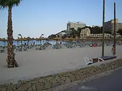 Palma Nova Beach is seven kilometers (4.3 mi) from Calvià, situated between Punta Nadala and es Carregador, on the Spanish Balearic island of Majorca. Besides Palmanova beach, other names by which the beach is known include "Playa de Palma Nova",[map 1] and "Platja de Palma Nova". The Palma Nova sea front has three beaches: Torrenova, Es Carregador, and Palma Nova.[1] The beach has had an extension of 500 meters (1,600 ft) and has needed an artificial regeneration to achieve the current aspect of fine and white sand, as well as its dimensions.