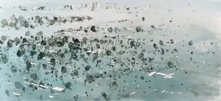 Pamela Helena Wilson (formerly Pamela Wilson-Ryckman, born 1954) is an American artist. She is best known for watercolor drawings and paintings derived from photographs, largely of news events, architectural forms and landscapes.[1][2][3] Her journalistic sources frequently portray scenes of natural and human-made calamity and the conflict, devastation and reactions that follow, often involving teeming crowds and demonstrations (e.g., Old Man River, 2007).[4][5][6] Wilson's process and visual editing obscure these events, translating the images into suggestive, new visual experiences with greater urgency, universality and an open-endedness that plays against expectations.[7][8][9] In 2013, critic Michelle Grabner wrote, "The luminosity of watercolor on white paper and the alluring atmospheric effects [Wilson] achieves in this medium creates images that are neither photographic or illustrational but seductively abstract and representational."[10]
