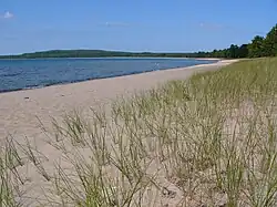 Pancake Bay is a sheltered, south-facing bay on the eastern shore of Lake Superior, north of Sault Ste. Marie, Ontario, Canada. A 5.5-kilometre (3.4 mi) sand beach lines the bay of which 3.5 km are within the park boundary. The bay is sand filled and shallow, which helps to warm the lake. Ancient beach ridges are visible more inland. The ecology of the region is characteristic of the Great Lakes-St. Lawrence transition forest, but is a northern shelter for more southerly flora and fauna.[3]