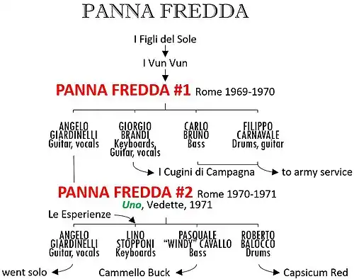 The band formed in 1967 as a six-piece playing in Roman nightclubs, initially under the name 'I Figli del Sole', but later changed to 'I Vun Vun' after the club where they performed most often. After talks with the record company Vedette, they released their sax and horn players and changed their name to Panna Fredda. In 1970 they released their first single Strisce rosse/Delerio for Vedette, and in the same year a second single Una luce accesa troverai/Vedo lei followed.[1]
