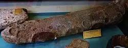 The armour of Panochthus, as in other glyptodonts, consisted of multiple structures. The skull was capped by a cephalic shield, a large mass of bone covered in small osteoderms;[4] the osteoderms of P. frenzelianus' cephalic shield, as originally noted by Ameghino, were smaller than in other species.[11][21] Over the torso was the dorsal carapace, a large structure consisting of numerous transverse rows. The armour of the tail consisted of multiple structures: a set of smaller caudal ring for around the first half, and then a fused caudal tube for the distal half.[21][14] Pathologies to the caudal vertebrae suggest that the caudal tube was used in agonistic interactions both with other Panochthus and possibly with other taxa.[22] Two different caudal tube morphologies are observed in Panochthus: a thick, cylindrical morphology; and a flatter morphology, compared to a Viking sword, minus the hilt. Panochthus with the latter caudal tube morphology could likely deliver more efficient horizontal blows.[23] In P. intermedius, the lateral margins of the caudal tube bore a series of large depressions, which may have anchored conical spines,[23][24] similar to those proposed for Doedicurus.[25]
