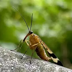 Panorpa japonica, the common Japanese scorpionfly, is recognized for its translucent wings with two black bands. It has a sleek, entirely black body and a distinctive curved snout as long as its thorax. Its long, thread-like black antennae nearly match the length of its body. It is a species from the genus Panorpa. It was originally described by Carl Peter Thunberg in 1784.[1][2][3]