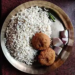 Panskurar Chop (Bengali: পাঁশকুড়ার চপ) a snack originating from the Indian subcontinent; in West Bengal at Panskura[1] "Panskura" means an area in Purba Medinipur district, and the word "chop"[2] means a small cutlet fritters or croquette in Bengali. It is served hot and warm along with muri (puffed rice), green chilies, and sometimes salads on dry Sal leaves. It is a vegetarian alternative, and an Indian Bengali equivalent of the aloo tikki of Mumbai.[3] It is said that in 1955 a local vendor Madan Mohan Dolai who was an ex karigar of Bhim Nag sweet shop Kolkata added some ingredients and modified the old style aloor chop to modern Panskurar chop. He also hired some local venders and started to sell and advertise it in different places of South Bengal.That was the time when local vendors selling food in Railways are popular for Madan Babur Panskurar Chop. Several people learned from him and started their own business from here(Natuda-Natur hotel, Jhantuda-Keshapath etc.). It started to lose its popularity after Madan Babu suddenly stopped the business due to his poor health in the late twentieth century. Now it can be found in various places in West Bengal.[4][5]
