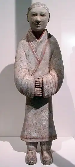 The jiaolingpao became a prominent form of attire in the Han dynasty; it was mainly worn by men, although it was sometimes worn by women. Even with the rising popularity of jiaolingpao, women continued to wear shenyi.[4]: 12 In the Han dynasty, jiaolingpao was typically worn by the members of royalty and by the aristocrats as an outerwear.[16] It was also the uniform of government officials.[16] Around the 206 BC, the jiaolingpao worn by elders had large sweeping sleeves which would be tied tightly to the wrist.[17]: 529 The jiaolingpao could be found in different length; the jiaolingpao, which could reach down to the ankles, were usually worn by scholars or elderlies whereas knee-length jiaolingpao were worn by warriors and heavy labourers.[4]: 13 [6]: 217 Elderlies started to wear the ankle-length jiaolingpao after 206 BC.[6]: 217