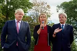 Despite being considered a caretaker Prime Minister upon his appointment, during his time in office Gentiloni successfully delivered major reforms that had been delayed for many years, including the implementation of the advance healthcare directive and the passage of a new electoral law.[8][9] He also introduced stricter rules on immigration and social security, in an attempt to counteract the European migration crisis.[10] In foreign policy, Gentiloni built on his time as Foreign Minister by projecting a strong Europeanist stance, whilst at the same time building close relations with the Arab countries of the Persian Gulf, and notably overseeing a normalisation of Italian relations with India after years of tensions.[11][12] Gentiloni resigned as Prime Minister following the 2018 election. In September 2019, he was nominated by the Conte Government to become Italy's new European Commissioner, and was given the key portfolio of overseeing the European Union Economy.