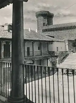 García Álvarez de Toledo's son, Fernán Álvarez de Toledo y Zúñiga, the second lord of Oropesa, with his wife Elvira de Ayala, lady of Cebolla,[6] built the first palace and enlarged the castle at the end of the 14th century.[7] This palace, on the north side of the castle complex and abutting the castle, is a Mudéjar-Gothic building with a long hall room on the upper floor approached from the courtyard by a wide stone interior staircase.[2] The hall was embellished by a polychrome wooden coffered ceiling decorated with the coat of arms of the Álvarez de Toledo family and those of other families connected by marriage. A mirador (lookout point) was built onto the hall, as an internal balcony or loggia open to the air with four foliated Gothic arches. The exterior arch spandrels displayed three coats of arms, one being of the Álvarez family and the other two of the Zúñiga family.[8] Plateresque details were added to the first palace in the 16th century.[2]