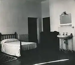 When the Civil War ended in April 1939 with Francisco Franco established as dictator of Spain, the original Parador establishment within the New Palace was found to have been so comprehensively damaged by shelling and machine-gunning and by over two-and-a-half years of occupation as barracks that it had to be repaired and remodelled. The architect appointed to carry out this task was Luis Martínez Feduchi Ruiz, who had carried out the original conversion.[7] He took the opportunity to expand the Parador into adjoining areas of the buildings, including former teachers' homes on the main floor and some of the ground floor premises.[15] The general facilities were improved and there were now eight double rooms and one single, six of them en suite, and shared bathroom facilities for those rooms which lacked them. The public rooms comprised a dining room and two lounges with grand fireplaces. The Parador de Oropesa reopened to the public on 12 December 1942.[15]