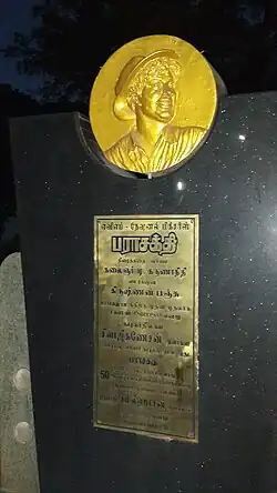 In celebration of the film's 50th year,[80] Ganesan's autobiography, entitled Enathu Suya Sarithai (transl. My Autobiography) was released on 1 October 2002 in Tamil, exactly a year after the actor's death in 2001. The English version, titled Autobiography of an Actor: Sivaji Ganesan, October 1928-July 2001, was released exactly five years later in 2007.[81] To commemorate 50 years since the release of Parasakthi, a memorial was inaugurated in AVM Studios on 17 October 2002 by Kamal Haasan in the presence of Ganesan's sons Prabhu and Ramkumar.[82][83] The memorial stands at the same place where Ganesan first faced the camera. A slab of black granite, the memorial has on its top a brass medallion that bears a close-up of Ganesan uttering his popular opening line "Success". At its bottom is a rectangular plaque that gives details about the memorial's inauguration. At the base of the rectangular plaque are two other plaques resembling the pages of an open book and contains the names of the technical crew and all those involved in the making of the film.[84] The visage of Ganesan wearing a hat was designed by Thota Tharani.[85] The 2003 film Success, starring Ganesan's grandson Dushyanth Ramkumar, was named after Ganesan's popular line.[86]