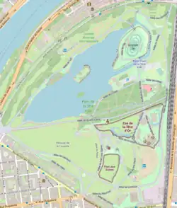 The park has large grassy areas and rolling terrain. It is bordered by a dike that separates the Rhone and on which the fair and exhibitions were held. After the moving of the Exhibition Centre to the suburbs, in Chassieu, the site became a housing complex with offices, apartments and buildings devoted to entertainment, including the International City of Lyon and the 3000-seat Amphitheatre of the Palais des Congrès of Lyon. A vast lake of 16 hectares can indulge in the pleasures of boating in summer, thanks to the pier located on the south bank. In the northern part of the lake rise two wooded islands, the Île des Tamaris, accessible only by boat, and the Île du Souvenir on which is erected a memorial in the shape of a quadrilateral. Formerly called Île des Cygnes, it has been converted after plans by the Lyon architect Tony Garnier and the 1904 Prix de Rome sculptor Jean-Baptiste Larrivé to honour soldiers killed in combat. The soldiers' names are engraved on the outer sides of walls. An underground corridor provides access to the island, the staircase that leads literally immersed under the lake.