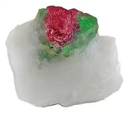 Spinel and pargasite in marble, Luc Yen District, Vietnam. Specimen size: 4.5 × 3.5 × 3.5 cm.