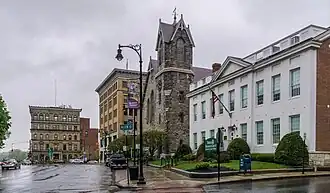 When first listed on the National Register of Historic Places in 1975, the district encompassed the park and eight buildings that faced it, including the Old Town Hall, the county courthouse, the Berkshire Athenaeum, and the First Church of Christ.[2] In December 1991, the boundaries were expanded to the area roughly bounded by East Housatonic, South, North and Fenn Streets, and Wendell Avenue, adding 39 buildings to the district. Notable buildings included in this extension include the present City Hall (a repurposed post office building), the Berkshire Life Insurance Company Building, the Allen Hotel, the Berkshire Museum of Art and Natural History, and the Masonic temple.[3]