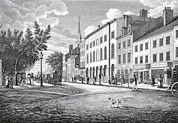 The Park Theatre c. late 1820s. The theatre had been rebuilt after burning down in 1820. Neighboring buildings include the City Coffee House, Sweeney's Porter House, the Theatre Hotel, and other commercial establishments.