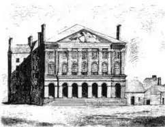 The section of Manhattan where the theatre stood was not stylish: the New Theatre, as it was called, was neighbor to Bridewell Prison, a tent city's worth of squatters, and the local poorhouse.[5] Lewis Hallam, Jr., and John Hodgkinson, both members of the John Street Theatre company, obtained the building's lease. They hired remnants of the Colonial Old American Company to form the nucleus of the theatre's in-house troupe and thus give the establishment the sheen of tradition and American culture.[6] Meanwhile, the men quarreled, and construction continued languorously. The theatre finally held its first performance on January 29, 1798, despite still being under construction. The gross was an impressive $1,232, and, according to theatre historian T. Allston Brown, hundreds of potential patrons had to be turned away.[7]