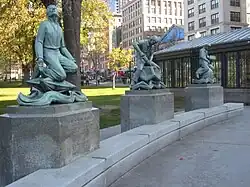 The sculptures were commissioned by the George F. Parkman Fund, and surveyed by the Smithsonian Institution's "Save Outdoor Sculpture!" program in 1993.[1]
