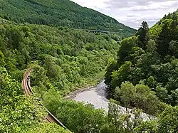 The Pass of Killiecrankie is a gorge at the lower end of Glen Garry in Atholl, Scotland. It leads from Glen Garry into Strath Tummel. The A9 Road, the Highland Main Line, and a former military road all run through the pass. The village of Killiecrankie lies at its northern end.