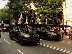 Officers from the Special Actions Unit, Royal Malaysia Police, on the Kia Rapid Intervention Vehicle at the Sultan Abdul Samad Street for the 2015 National Day Parade in Kuala Lumpur. They dons the new Marine Ops Core tactical helmets and new Ferfrans SOAR carbines.