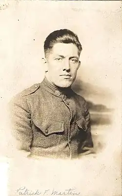 Patrick was inducted into the Army on September 20, 1917, at age 23 in Brooklyn, and served in World War I as a Corporal. He fought in the Battle of Château-Thierry (1918) France from April 6, 1918, to March 11, 1919, with the 306th Infantry Company C. While there, he received a machine gun wound to his leg October 1, 1918. The crucifix in his pocket helped to deflect the bullet, and he was awarded the Purple Heart. Patrick received an honorary discharge on March 28, 1919, and was also given a Victory medal and 2 Battle Clasps. Patrick was reported to be single, 5'11” tall, with blue eyes and brown hair.