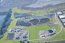 Working as a member of the Carollo Engineers design team, Johanson helped create a new water treatment facility. By overlaying art, public access, sewage treatment, habitat restorations, and agriculture, she embedded major urban infrastructure within living nature. Her design has been credited with "re-inventing art and reforming civil engineering".[48] The project includes natural systems to treat sewage, allowing millions of gallons of water to be reused. Johanson used the form of the endangered Salt Marsh Harvest Mouse to create the shapes of the polishing ponds, which contain islands that direct the flow of water and provide nesting habitat for birds. Other plantings support local wildlife. An additional 230-acre (0.93 km2) area of tidal wetlands was acquired for the park and wildlife sanctuary.[49][50] This multi-purpose landscape provides more than 3 miles (4.8 km) of walking trails for educational programs, nature study and tourism. Petaluma Wetlands Park coincides with a $150 million sewage treatment facility, while also serving as a highly visible model for converting sewage into recycled water, which is stored in a deep reservoir at the end of the "mouse's tail".[51]