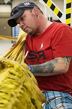 Patrick McDonald helps repack a B-52H Stratofortress drag chute during a tour of Barksdale Air Force Base in 2014