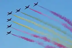 Planes of the Spanish Patrulla Águila ("Eagle Patrol") in an exhibition parade. The colors are those of the Spanish flag