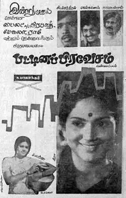 Pattina Pravesam (/pəttinəˈprəvsəm/ transl. Entering a City)[3] is a 1977 Indian Tamil-language drama film written and directed by K. Balachander. It is based on the play of the same name, written by Visu and staged the same year. The film stars Delhi Ganesh, Sivachandran and Sarath Babu, all making their cinematic acting debuts. It was released on 9 September 1977. How the film "closely resembles" two films show at film festivals in India about that time, "The Conquerors of the Golden City' (1965) and the 1964 film Birds of Exile (Gurbet Kuslari in Turkish) has been noted.[4]