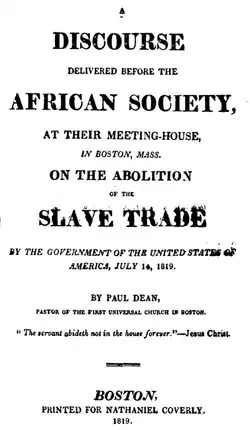 Title page of Dean's A discourse delivered before the African Society, at their meeting-house, in Boston, Mass. on the abolition of the slave trade by the government of the United States of America, July 14, 1819