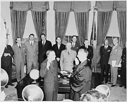 President Harry S. Truman nominated Hoffman to lead the Economic Cooperation Administration (ECA) in April 1948. Truman initially wanted to nominate Dean Acheson, but Hoffman was a more acceptable candidate to Congress, which preferred someone with more business acumen.[4] In this role as administrator, he was responsible for managing the distribution of U.S. aid to post-WWII Europe. He primarily worked with the Organization of European Economic Cooperation (OEEC) and coordinated policy with the U.S. State Department.