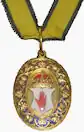 Dexter a Lion rampant guardant Or navally crowned Azure resting the dexter paw upon a decrescent Argent, sinister a Male figure representing slavery trowsers Argent striped Azure the upper part of the body naked holding in the dexter hand broken chains Proper the sinister arm elevated and holding a Cross Or.