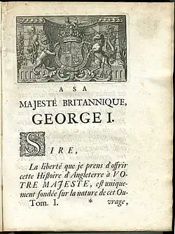 L'Histoire d'Angleterre was published monthly with illustrations and allegorical end pieces designed and engraved by François Morellon la Cave, and with a dedicatory epistle to King George I. The written style is lucid and effective. He stopped writing after dealing with the execution of Charles I of England in 1649.[16]