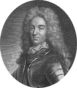 De Rapin and de Both joined in Ulster under the command of the 1st Earl of Athlone. During the Williamite war in Ireland de Rapin took part in the Siege of Carrickfergus, the Battle of the Boyne, and was wounded at the Siege of Limerick (1690).[1] Soon afterwards he was promoted to captain; but in 1693 he was asked to become tutor to the Henry, Viscount Woodstock.[4] Rapin accompanied his father William Bentinck, 1st Earl of Portland, a diplomat, at the Peace of Ryswick (1697), perhaps also to Paris in the year after; in a very costly entourage.[5] Bentinck was sent as ambassador to Paris for six months. While there, he opened negotiations with Louis XIV for a partition of the Spanish monarchy, and as William's representative, signed the two partition treaties, known as the Treaty of The Hague (1698).[1] Because of this Treaty all the diplomats settled in the Hague. In April 1699 Paul de Rapin married the widow Marie-Anne Testart (1676–1749) in a tiny village called Sloterdijk outside Amsterdam.[6]