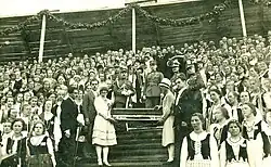 In 1928, Pavasarininkai received a letter from Pope Pius XI encouraging their activities.[4] In 1933, it was reorganized into a federation that united separate societies of men, women, and youth (ages 13–16). Local groups were also split by gender. The youth union was dropped in 1937.[5] A separate organization, Vyčiai (Knights) for urban Catholic youth was merged into Pavasaris in 1935.[8] The 25th-anniversary conference in June 1938 (delayed a year due to issues obtaining permits) was attended by as many as 45,000 people, including about 7,000 sports competitors and 6,000 singers in 247 choirs.[7]