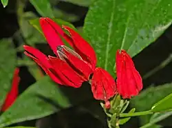 This subshrub is intermediate between the two species of origin in almost all respects, but it has nine to ten equal broad bracts and sub-entire leaf margins. It can reach a height of about 2 metres (6 ft 7 in). The unusual flowers are purple-grey enclosed within a bright red calyx. Flowering period is late Summer.