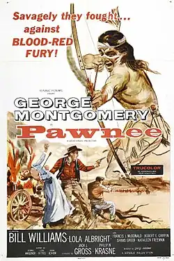 Pawnee is a 1957 American Western film directed by George Waggner and written by George Waggner, Louis Vittes and Endre Bohem. The Trucolor film stars George Montgomery, Bill Williams, Lola Albright, Francis McDonald, Robert Griffin and Dabbs Greer. The film, using footage from Buffalo Bill (1944) was released on September 7, 1957, by Republic Pictures.[1][2][3]