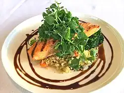 In Chinese cuisine, the most popular pea shoot dish is called suan rong chao dou miao (蒜蓉炒豆苗), which directly translates to stir-fried pea sprouts with garlic. Another Chinese dish features the vegetable in a light soup, called shang tang dou miao (上汤豆苗), which directly translates to bean sprouts in soup.[11] Due to their seasonal nature, dishes that feature the vegetable are often only offered during the winter months in China and many Chinese restaurants in the United States.[12] Pea shoots are particularly associated with southern China, including Yunnan, where their return signifies the start of the "spring feast" season.[13]
