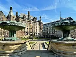 The Gardens were first laid out in 1938, following the demolition of St Paul's Church. Originally named St Paul's Gardens, they were immediately nicknamed the "Peace Gardens", marking the contemporary signing of the Munich Agreement.[1] The Gardens were originally intended to be replaced by an extension to the Town Hall, but due to the Second World War, this was never built.[2] In 1985, the space was formally renamed the "Peace Gardens".[3] The Sheffield gardens are a fine example of the network of similar gardens created between the two world wars and presage later gardens and community spaces in London and other urban centres.[4]