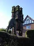 A red sandstone carving depicting an elephant bearing a castle stands in a garden on Stone House Lane in Peckforton village. It dates from around 1859 and is listed at grade II.[25][26] It was carved by John or William Watson, a local stonemason then working on Peckforton Castle who also carved stone lions now at Spurstow and Tattenhall.[25][26] The elephant and the castle are each carved from a single piece of stone, which derives from the same quarry as Peckforton Castle. The elephant has a tasselled saddle, supporting the castle which has three tiers, with a turreted gatehouse and a keep with turrets at the corner. Some of the castle windows are glazed.[25][26]