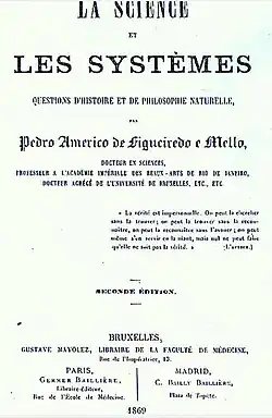 Pedro Américo also left several theoretical works in history, natural philosophy and fine arts, as well as poetry and novels.[5] However, this production is much less known and studied than his paintings, and its value has been questioned, but it is important for revealing other facets of Américos's thinking.[6][49] His first literary essays were poems written while he was studying at the Pedro II College,[6] and his most relevant text is Science and Systems: Questions of Natural History and Philosophy,[50] a thesis he defended at the Free University of Brussels. Considered the summary of his philosophical conception, he was well received and secured the position of adjunct professor at the university.[51] The thesis dealt with the historical evolution of the arts, philosophy and science, seeking a Renaissance universality of thought, and handled a great number of erudite references from various areas of knowledge.[49] Carolina Invernizio's analysis highlighted Américo's opposition to positivism, a very influential philosophy in France and Brazil at the time,[6] and his more direct affiliation, according to Sílvio Romero and José de Carvalho, was the spiritualist strand of French eclecticism, approaching the thinking of Victor Cousin, Jules Michelet and Edgar Quinet. For Américo, science, as well as art, should be exempt from particular obligations, abolishing dogmas, arbitrary opinions and exclusivist systems, seeing as essential to their flourishing free investigation, free creation and free thought.[51] In the thesis preface, Américo warned that:[52]