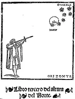 Cross-staff in Regimento de Navegación by Pedro de Medina, 1552. A goniometric instrument used to measure the altitude of stars.