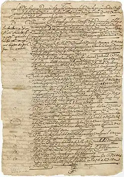 According to one source, Don Pedro de Peralta was a bachelor of canon law. A report of possessions found in his house after his arrest includes a law book.[3] Peralta was appointed governor of New Mexico by the Viceroy, Luis de Velasco, marqués de Salinas on 31 March 1609, shortly after Peralta had arrived from Spain.[4] Juan de Oñate had asked Velasco for compensation for his efforts in New Mexico, and asked that his son Christóbal be allowed to succeed him. Valasco replied that he had named Peralta as governor, and that Onate should hand over to him when he arrived at the Rio Grande and should then return with his son to Mexico City without delay.[5] An expedition with supplies and reinforcements left for the north late in 1609. Peralta reached the capital, La Villa de San Gabriel, early in 1610. He was met by Oñate, who left for the south in early February to face charges of maladministration.[6] Peralta brought twelve soldiers and eight Franciscan priests with him.[2] His instructions included searching for the Straits of Anián,[a] on which he should establish a secure port.[8]