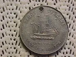 A token was produced and circulated in 1875 to celebrate the "Peggy Stewart" incident. After the American Revolutionary War, citizens of Maryland came to view the burning of Peggy Stewart as an act of heroism, considering the angry crowd who demanded the burning to be devoted patriots for their resistance of the British Tea Act. On October 19, 1904, the city of Baltimore commemorated the event with The Burning of the Peggy Stewart, a mural by Charles Yardley Turner (1850–1919), painted on the west wall of the Criminal Court Lobby in the Clarence M. Mitchell, Jr. Courthouse.[14] On October 19, 1974, the Bicentennial Council of the 13 Original States created a silver ingot honoring the two-hundredth anniversary of the burning. The incident is also honored by "Peggy Stewart Tea", a blend sold by Eastern Shore Tea Co. The burning is honored each year by a ceremony in Annapolis. The story was recounted in a children's book Ahoy, Peggy Stewart by Maud Esther Dilliard, published by Dutton, 1956.