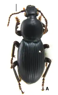 Adults reach a length of about 10 mm. They have an elongate, flat body. The disc of the head, pronotum and elytra are shiny black.