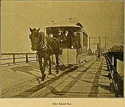 City Island residents had complained about the horse-drawn service, and one newspaper reported that "the cars were off the rails almost as much as they were on them".[22] In October 1908, application was made to the New York State Public Service Commission to change the motive power of the railroad from horse to overhead electric current.[23] A hearing was held on November 6[24] and final approval issued on November 17.[25][26] The route was described as:[18]