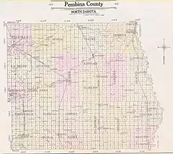 The Dakota Territory legislature created Pembina County on January 9, 1867, from previously unorganized territory. Its government was organized on August 12 of that same year. It was named for a Chippewa term for stab or stabbing.[5] Pembina, the oldest European-American settlement in the future state, was the county seat. In 1911 the seat was relocated to Cavalier.[6][7]