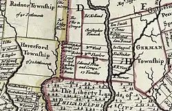 3. ^ Pencoyd Farm was in Merion Township, Philadelphia County, as shown on Thomas Holme's 1687 survey. The farm's southern property line formed part of the boundary with the "Liberty Lands" of Blockley Township, Philadelphia County. Merion Township was divided into two sections in 1713, and the farm became part of Lower Merion Township, Philadelphia County. When Montgomery County was carved out of the central portion of Philadelphia County in 1784, Lower Merion Township became part of the new county, and the farm's southern property line became part of the boundary between the counties. Philadelphia City remained about 2 square miles from 1682 to 1854, when the Consolidation Act merged the city and Philadelphia County, resulting in a consolidated city-county of 141.7 square miles (367 k2). The farm's southern property line became part of the boundary between Montgomery County and the City of Philadelphia, and the road straddling the boundary became City Avenue.