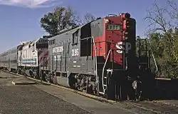 The Train Masters were complemented by a fleet of EMD GP9s fitted with steam generators; while peak-hour trains required one Train Master or two GP9s, off-peak and weekend trains could more economically use a single GP9.[54] Switching duties were handled by an ALCO RS-32,[56] or an ALCO S-4. When Amtrak took over inter-city (main-line) service in 1971, the SP EMD SDP45s then in main-line use were reassigned to Commute service, and three unique passenger-equipped EMD GP40P-2 engines were delivered in 1974, allowing SP to retire all of the Train Masters by 1975.[56][60] The fleet of EMD GP9s, SDP45s, and GP40P-2s were used by SP to run the Peninsula Commute.