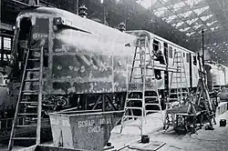 On March 25, 1977, 4935 was taken to the Wilmington Shops in Wilmington, Delaware. Amtrak replaced truck bearings, a blower, the boiler (used for steam heating of passenger cars), and made other mechanical repairs. The locomotive was grit-blasted, primed, and repainted into original PRR livery of dark Brunswick green with five golden stripes.[2]
